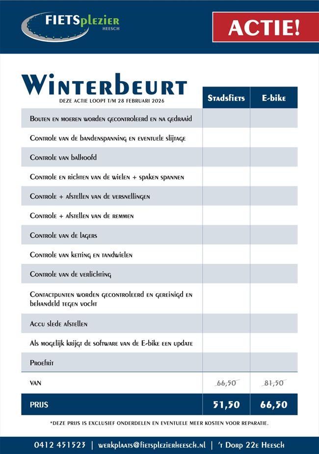 "Weer of geen weer, met een goed onderhouden fiets geniet u altijd van uw rit. Laat onze ervaren fietsmonteurs uw fiets een winterbeurt geven. Zo bent u verzekerd van een veilige en comfortabele winter. Maak snel een afspraak, want onze agenda loopt al vol."