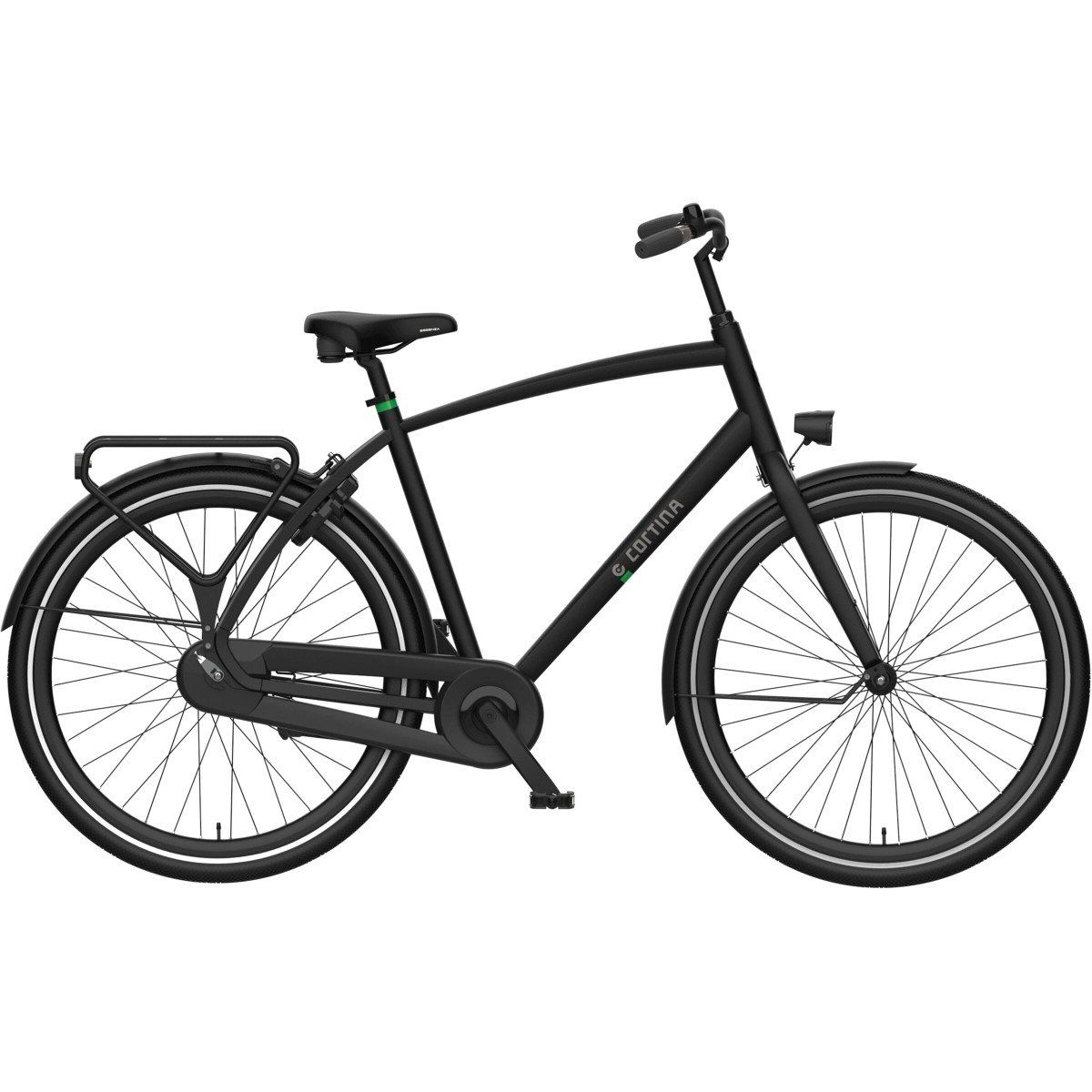 Cortina Tide herenfiets in framemaat 57 cm. Kleur: Jet Black Matte. Uitgerust met achter een Shimano Nexus 7-traps versnellingsnaaf met rollerbrake en voor een Shimano naafdynamo met rollerbrake. Kleurcode: UZZ 69005 Matte.